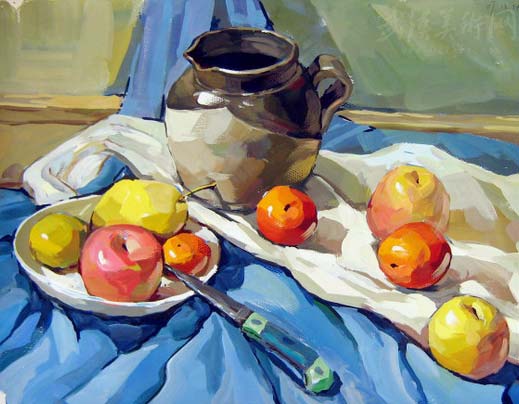 在用色方面要尽量饱和些,不宜干枯。在同一白盘子内,冷暖反差、明度反差都不宜过大。颜色的调配应以白色为主,就像做菜,每一道菜应有一样主料,画白盘子的主科是白色,其余的冷暖色只是配料。我们在作画时切勿喧宾夺主,否则会失去白盘子的色彩与质感。此点往往为许多考生所忽视,从而失去了一些本质的东西。